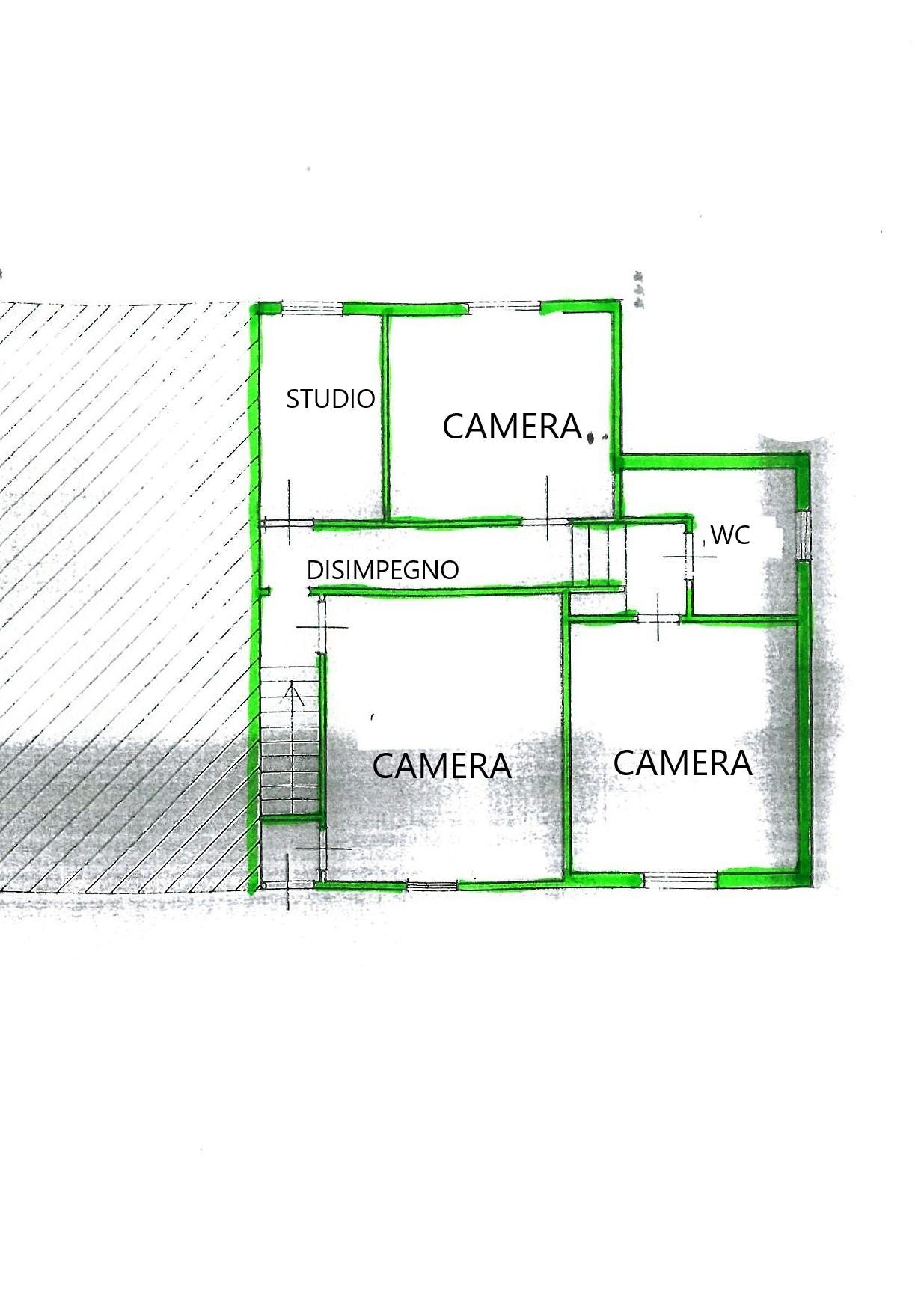 Caratteristiche dell'immobile: Al piano terra, l'ingresso introduce in un luminoso soggiorno con camino, perfetto per accoglienti momenti in famiglia, collegato a un pratico ripostiglio e alla zona pranzo con cucinotto separato. Una scala interna conduce al primo piano, dove troviamo due grandi camere matrimoniali, una camera media, uno studio/cameretta, e il bagno. Al piano terra, collegato al soggiorno, si accede a un'ampia cantina con locale tecnico.